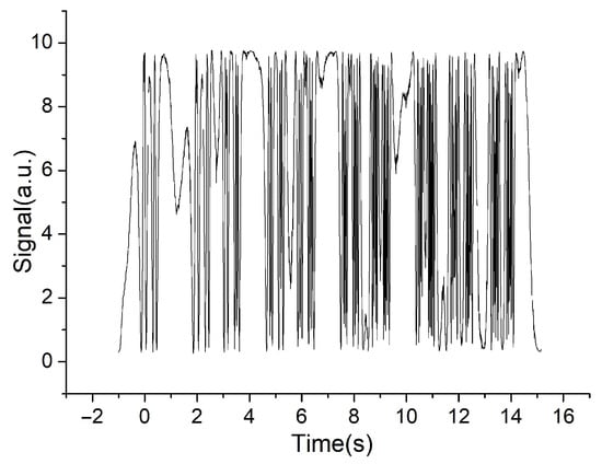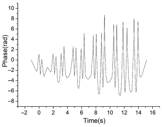 Analysis of the interference signal’s phase change, predicated on the assumption that the rail undergoes convex deformation beneath the wheel, reveals that as the train traverses the sensor, the rail between its wheels exhibits both convex and concave bending. The temporal evolution of this phase change, (t), was obtained through phase demodulation. This (t) signal, which correlates with the Iint(t) signal depicted in Figure 4, is displayed in Figure 5.