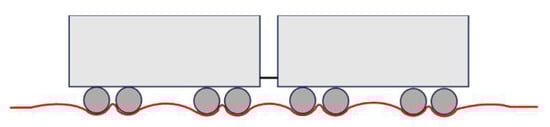 As depicted in Figure 6, the rail exhibits characteristic deformations: a convex bend directly beneath the wagon wheels, a concave bend within each railway bogie (between two wheels), another concave bend occurring between adjacent bogies, and further concave bends at the train set’s leading and trailing ends. This deformation pattern propagates along the rail as a traveling wave, a direct consequence of the train set’s motion. The magnitudes of these localized convex and concave bends are contingent upon the forces transmitted by individual wheels to the track and the deformational characteristics of the railway superstructure. Assuming consistent deformational properties of the railway superstructure within a chosen section of the track, the extent of individual rail bends will solely correlate with the forces (or weights) exerted by the respective wheels. Thus, the rail bending observed during the passage of a train set offers a viable means for determining individual wheel weights.