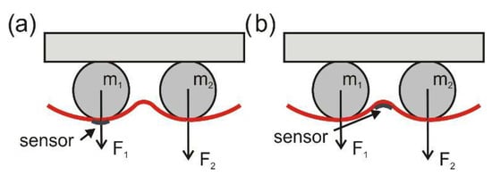 A maximal convex bend is observed when one of the bogie’s wheels is situated directly above the sensor fiber’s centroid (Figure 7a). Conversely, a maximal concave bend occurs when the bogie’s wheels are symmetrical to the sensor fiber’s centroid (Figure 7b). The peak extension of the optical fiber during a convex bend is individually dependent on the gravitational forces F1 and F2, which are exerted perpendicularly to the rail directly above the sensor’s center and are a consequence of the wheel loads m1 and m2 on the railway bogie. Similarly, the optical fiber’s maximum length during a concave bend is governed by the gravitational forces F1 and F2, corresponding to the masses m1 and m2, spatially distributed around the sensor fiber.