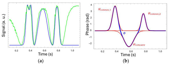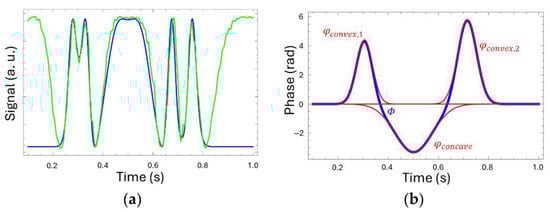 Correspondingly, Figure 8b, Figure 9b, Figure 10b and Figure 11b present the theoretical phase change derived from the interference signals shown in Figure 8a, Figure 9a, Figure 10a and Figure 11a. These theoretical phase changes are calculated using Equations (3) and (4), and their sum (5).