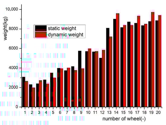 The individual weights obtained from static scales were divided by their respective An values, which we determined. Recognizing that the individual proportionality constants exhibited variations across different wheels, we established the overall proportionality constant, Kp, via arithmetic averaging. The calculated Kp value, employed for determining weights from the measured An values, is 680 kg/rad. The weights thus calculated are presented in Table 1.
