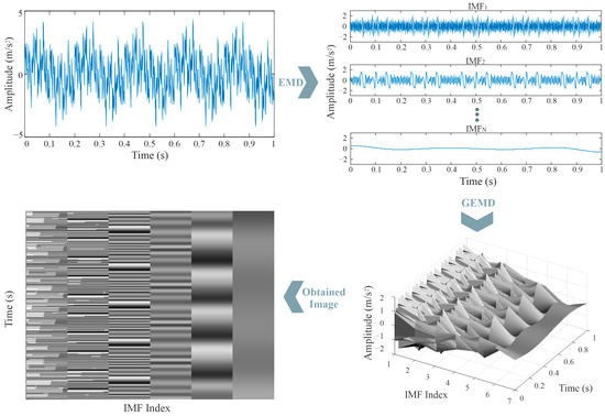 To achieve this transformation, the GEMD technique is employed in this work. This technique converts the set of IMFs into a grayscale image representation through the following steps, which are described below and illustrated in Figure 2: