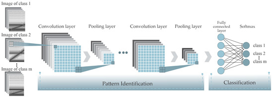 CNNs represent an innovative DL approach that is particularly effective for pattern recognition in images and time signals. Unlike other processing methods, CNNs integrate feature extraction and classification within a single learning framework, enabling automatic pattern identification in one-dimensional signals or images without requiring manual feature engineering during preprocessing and testing [45]. In particular, a CNN is composed of four fundamental layer types: convolutional, pooling, fully connected, and SoftMax layers (see Figure 3). Each of these layers serves a distinct function in the data processing pipeline [46].