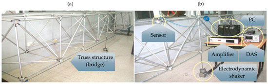 Proposed experimental setup. (a) Experimental truss bridge; (b) setup for experimentation.