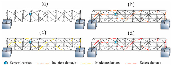 Placement of the sensor (indicated by a blue dot) and identification of corroded elements on the bridge (represented by colored lines). (a) Intact structure, (b) early- or incipient-stage damage, (c) moderate deterioration, (d) severe degradation.