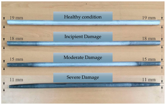 Since natural corrosion is a slow process [55], an accelerated approach was implemented to evaluate its effects on the structural behavior of the experimental truss. To induce controlled external corrosion, the ends of aluminum bars were immersed in hydrochloric acid, leading to progressive material loss. The undamaged bars have a diameter of 19 mm and a mass of 445 gr. After corrosion, the bars exhibited diameter reductions of 1 mm, 4 mm, and 8 mm at their extremities, corresponding to incipient, moderate, and severe damage levels, respectively. These reductions were associated with mass losses of 19.7 gr, 49.7 gr, and 84.4 gr relative to the intact element. The selected damage levels ensured that the structural integrity of the bars was maintained throughout the experiment, allowing for a controlled yet realistic representation of material degradation [50]. Figure 6 illustrates the different corrosion conditions, including an intact bar and those with varying degrees of deterioration or corrosion. It is important to mention that the corrosion was induced only at the bars’ ends in order to represent damage scenarios in the most critical parts of the truss-type bridge (zones of bars’ ends/joints), which are considered as stress concentrators regions where the bridge will tend to fail first due to the degradation of those elements. In this way, we generated realistic damage cases where corrosion may begin at the bars’ ends and, consequently, the proposed methodology was validated under more rigorous conditions; that is, the method was applied to detect damage where corrosion reduced the diameter of the bars only at the ends rather than throughout the entire bars.