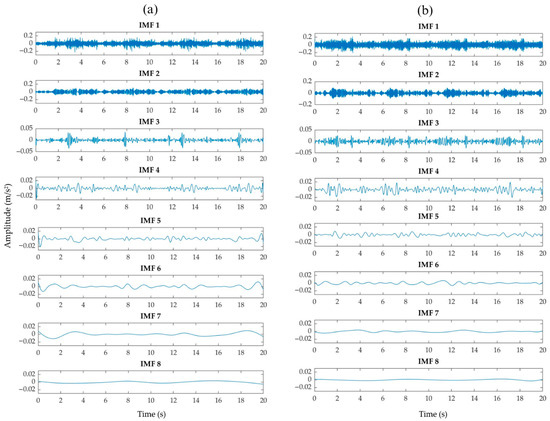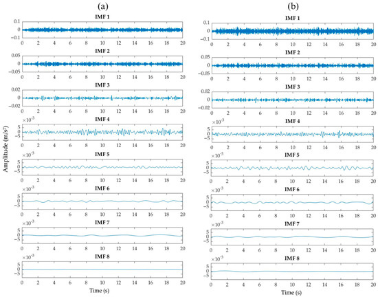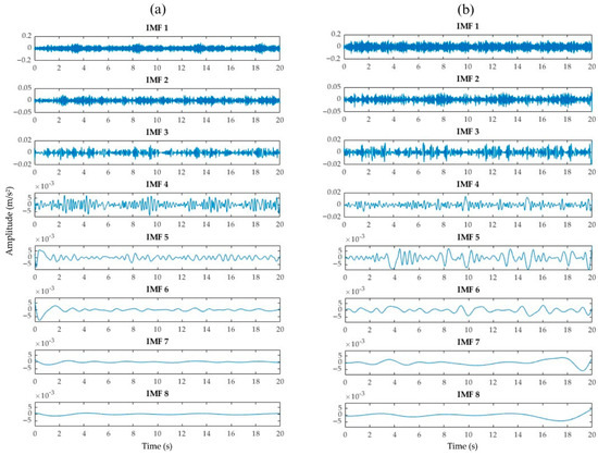 Comparison of the 8 IMFs between (a) signal without corrosion and (b) signal with severe corrosion from Vx-axis.