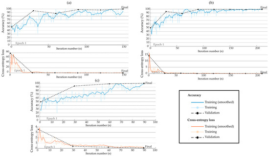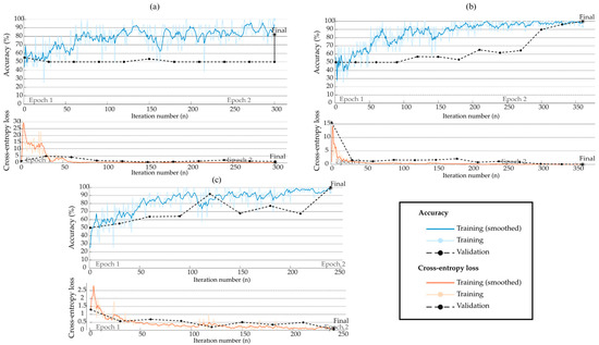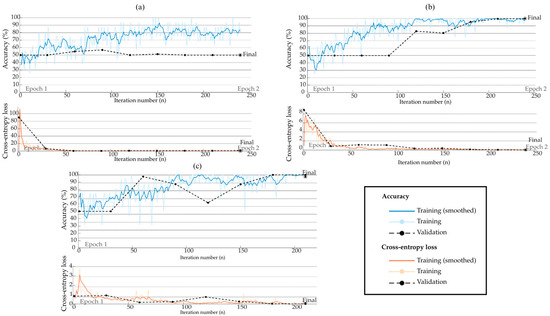 Figure 10, Figure 11 and Figure 12 show the obtained results of CNNs with one, two, and three convolutional blocks. In particular, these figures show the loss and accuracy curves obtained during the training process for each axis. It is crucial to mention that all reported performance metrics refer exclusively to the independent test set to ensure a robust evaluation of the model’s generalization capability. These plots provide insight into each configuration’s convergence behavior and classification consistency. This helps evaluate the CNN’s capability of learning relevant features for classifying structural integrity from high-resolution images. In particular, the loss curves correspond to the cross-entropy loss function, which is widely used for binary classification problems and is dimensionless; therefore, no physical units are included on the vertical axis. The x-axis indicates the iteration number, ranging from n = 0 to i iterations. Additionally, the Adam optimizer was employed to update the model weights during training due to its efficiency and adaptive learning rate properties. According to these figures, it can be observed that when a single layer with 256 neurons is selected (see Figure 10a and Figure 12a), the CNN’s accuracy decreased significantly, limiting its capability of distinguishing between the two conditions. On the other hand, the configuration of two and three convolutional blocks presents similar results. Therefore, a two-convolution-block configuration is chosen to preserve the ability to detect fine details in the evaluated images, while maintaining a convenient computational cost and adequate accuracy.
