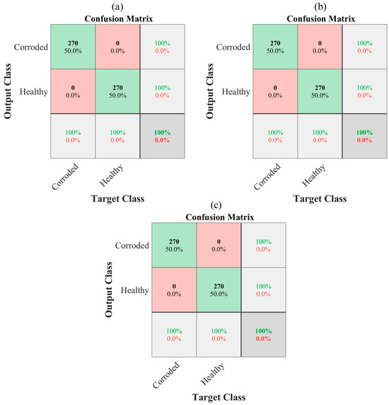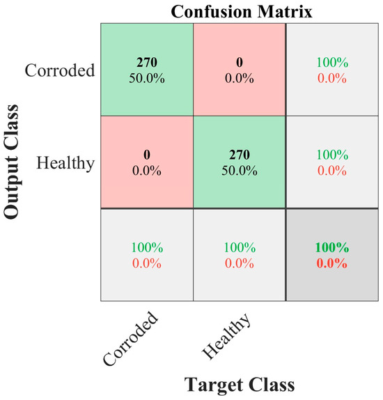Since each axis contributes independently to classification, a rule-based expert system is implemented to enhance robustness. This system integrates the CNN outputs of the selected configuration, B, i.e., 32 filters for the first layer, 64 filters for the second layer, and 64 filters for the fully connected layer per image of 128 × 128 pixels for the Vx, Vy, and Vz axes, applying the decision rules established in Section 2.3 to ensure a healthy and corrosion assessment without importing the level of corrosion. By incorporating these predefined rules, the expert system enhances reliability in corrosion detection, mitigating errors due to isolated misclassifications from individual CNNs, resulting in an accuracy of 100% in distinguishing between healthy and corroded conditions. It is essential to mention that the expert system was tested with 270 images for healthy and corroded conditions, respectively, corresponding to 10% of the total number of images available, which were selected randomly. This approach ensures that uncertain cases trigger further investigation rather than leading to ambiguous assessments, supporting early-stage structural health monitoring and proactive maintenance strategies. Figure 17 shows the confusion matrix of the expert system. In this case, it is observed that the system complements the information coming from each axis, since it avoids partial discrepancies and consistently detects between healthy and corroded (regardless of the corrosion level of the bar).