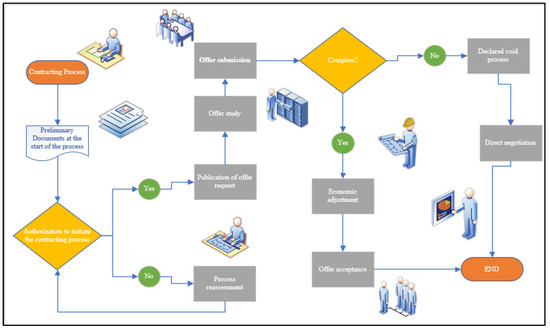 According to Colombia Compra Eficiente [26], the main stakeholders involved in public procurement processes include the state entity, which owns the contract and is responsible for structuring the specifications, awarding the contract, and overseeing its execution. Next are the contractors, supervisors, and auditors, who may be designated by the state entity or appointed by third parties. Their role is to monitor the execution of the contract and ensure that the contractor meets its obligations. Lastly, the beneficiaries (namely, the citizens) play an indirect yet significant role by participating in citizen oversight mechanisms. These mechanisms are designed to ensure the transparent use of public resources. Figure 1 illustrates Colombia’s public procurement process structure, highlighting the main activities that must be completed before contract execution begins. Understanding the functions of these actors is crucial for identifying potential critical points in the process where delays and cost overruns are likely to occur, particularly in rural road infrastructure projects.