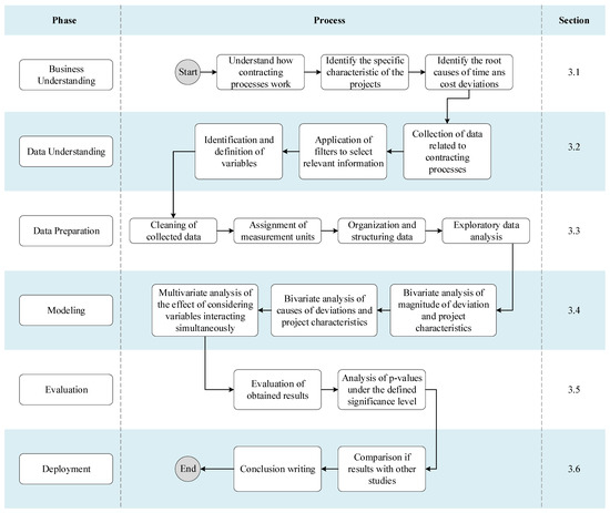 Table 1 summarizes previous research on cost and time deviations in road infrastructure projects. The symbol “✓” indicates that the referenced source reports the corresponding factor. In contrast, the notation “N/P” denotes that the mentioned factor is not present or not addressed in the cited reference. Most studies on time and cost overruns have been conducted in urban areas or along major highways, particularly in Asia, the Middle East, and Africa. While these studies provide valuable information, they largely rely on qualitative or perception-based methodologies, such as surveys and interviews, and generally lack access to official, public, or audited datasets [36,37,38]. Moreover, the literature does not specifically address the unique characteristics of rural road projects or focus on contexts in Latin America, where operational, institutional, and territorial challenges differ significantly. To fill this gap, the present study makes a novel contribution by focusing exclusively on rural road infrastructure projects in Colombia. It utilizes a public government database that contains empirical information from 229 completed projects. Unlike previous research, this study applies statistical techniques within the CRISP-DM framework, allowing for the quantification of relationships between variables and the prioritization of the main causes of deviations based on objective and replicable data. Additionally, it incorporates underexplored variables in the literature, such as contract modality, funding source, intervention level, and local institutional conditions.