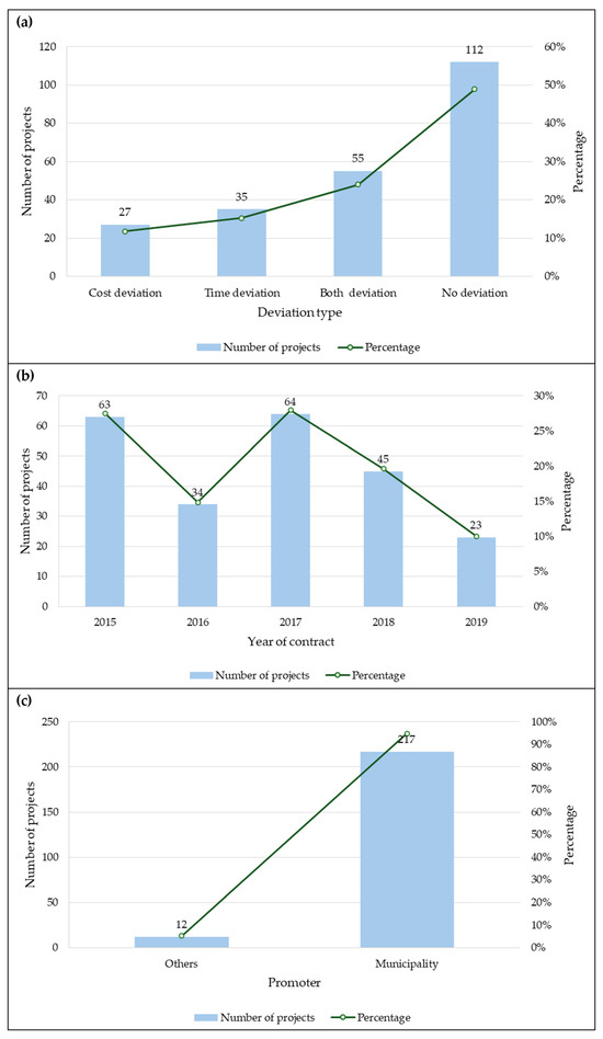 Number of projects according to (a) time and cost deviations, (b) contract signing year, and (c) promoter.