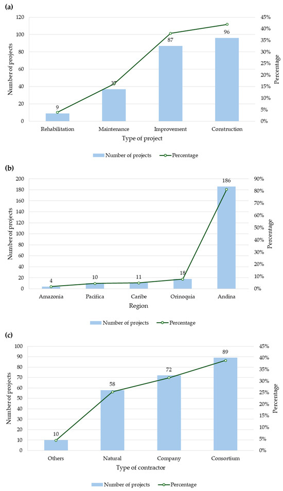 Figure 4b illustrates the geographic distribution of the 229 rural road projects analyzed. A significant majority of these projects, totaling 186 (81.2%), were located in the Andean region. In contrast, the Orinoquía region accounted for only 18 projects (7.9%), while the Caribbean and Pacific regions had 11 (4.8%) and 10 projects (4.4%), respectively. The Amazon region had the smallest share, with just four initiatives (1.7%). This noticeable imbalance reflects Colombia’s demographic and economic center: most rural settlements, agricultural corridors, and tertiary roads in need of rehabilitation or upgrading are found in the Andean highlands. Conversely, the Amazon and Pacific basins, which are characterized by lower population densities and limited road networks, attract relatively fewer investments. Figure 4c shows the project distribution based on the winning contractors’ legal status. Consortia were the most common, securing 89 contracts (38.9%), which highlights the frequent need for combined technical and financial resources to meet the public tender requirements for road construction projects. Corporate entities that participated individually followed, winning 72 projects (31.4%). Natural persons obtained 58 contracts (25.3%). The “other” category, which included foundations and mixed-economy firms, accounted for only 10 projects (4.4%). The dominance of consortia and corporate entities indicated that institutional clients prefer bidders who can leverage multidisciplinary teams and substantial bonding capacity, attributes that individual contractors often lack for rural infrastructure programs.