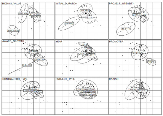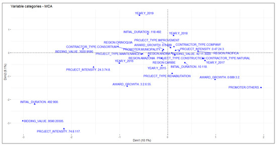 Then, unsupervised learning was developed through MCA, including the independent variables: bidding value, initial duration, project intensity, award growth, year, promoter, contractor, project type, and region, to analyze the relationships between them. The process began with the generation of new components. The explanatory capacity of each component was identified and the proportion of variance accounted for by each dimension was determined. The first component explained 10.2% of the variance and the second component explained 8.3% of the variance. One of the inherent characteristics of MCA is that the components, dimensions, or factors created do not necessarily explain large percentages of the total variance [74]. A biplot of the multiple correspondence analysis (MCA) with dimension 1 (Dim1) as the x-axis and dimension 2 (Dim2) as the y-axis helped to identify the variables that were most related to each dimension (see Figure 5). Variables with similar profiles were grouped. It could be observed that the variable “Bidding value” was most related to dimension 1 (x-axis). Since this variable was discretized, the group that contributed the most was the one corresponding to projects with a value greater than 9590 CMMLV (bidding value between 9590 and 20305). Similarly, promoters in the category “Others” also contributed to dimension 1. The variable project intensity contributed significantly (y-axis) to dimension 2, with values ranging from 78.8 to 1217, mainly corresponding to the year 2019.