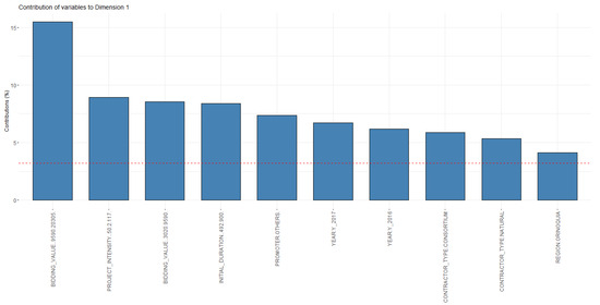 The ranking of variables contributing, in percentage, to dimension 1 (the first component) is shown in Figure 6. The red dashed line in the above graph indicates the expected average contribution. For a certain component, a variable with a contribution exceeding this threshold is considered important in contributing to the component. Variables above this line were the most important contributors (in this case all the included in the figure). The categories with a bidding value higher than 9590 and a project intensity higher than 50.2 were most important in defining the first dimension and also appeared in the first places in the second dimension. They were the most important for explaining the variability of the dataset.