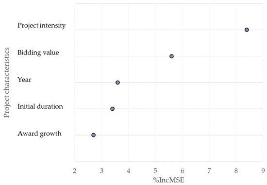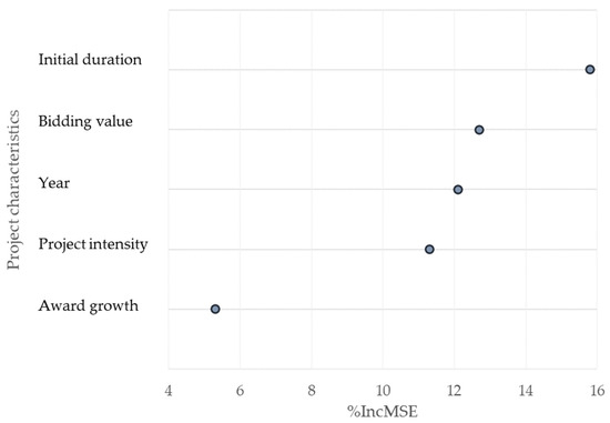The third step involved multivariate analysis to establish the effect of considering variables that interacted simultaneously [72]. If the dependent variable was numerical, the analyst chose from regression models (as in this case, with time and cost deviations); if it was categorical, the analyst selected from classification models. Multivariate analysis was performed comparing time and cost deviations with the independent variables simultaneously. Random Forest was implemented using a decision tree-based learning method. It handled both numerical and categorical variables simultaneously and ranked them by importance [72]. It generated numerous decision trees, each using a random subset of samples and variables. Key parameters included the number of trees and the random variables per tree. Optimal predictors were identified by running these trees and observing the changes in error [68]. The optimal number of trees was found when adding more trees provided no significant performance gain but increased computational cost. The literature suggests using 64 to 128 trees [73]. Random Forest allowed for a different analysis by considering the interaction between independent variables from a nonlinear perspective and ranking them in order of importance.