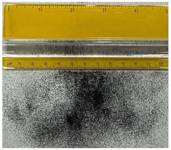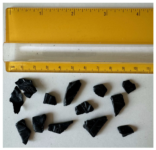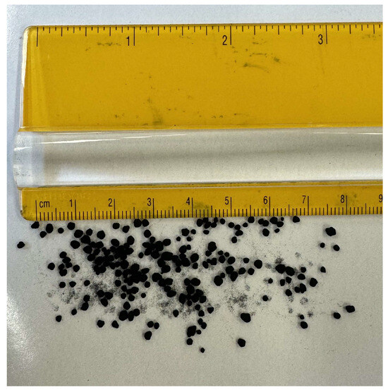 Carbon black, used as a complementary additive in this study, was sourced from Bolder Industries (Boulder, CO, USA), and produced through the processing of post-consumer and post-industrial tires and rubber scrap. Figure 3 shows the initial form of carbon black particles used in this study as agglomerated granules. Although initially agglomerated, the particles can be readily broken down into fine components smaller than 150 µm, corresponding to material passing a No. 100 sieve. Figure 4 illustrates the dispersed form of carbon black particles prior to their incorporation into plastic-modified asphalt. As shown in Table 1, the blending content of the ABS plastics was 2% and 5% by the total weight of the asphalt binder, and the dosage of carbon black was 100% of the blending content of the ABS particles (e.g., 5% ABS and 5% carbon black by the total weight of asphalt).