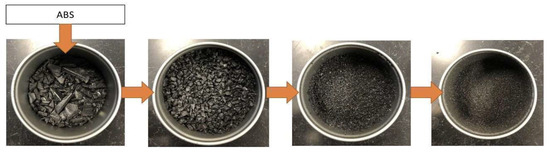 After the acquisition of bulk e-waste plastics, the particles were pretreated with liquid nitrogen to rapidly reduce the thermal condition of the plastics well below the glass transition temperature (Tg, approximately 105 °C), thereby inducing a brittle, glassy state that was sustained during the grinding process. This pretreatment enabled the efficient shredding of ABS plastics into finer particles during pulverization using an industrial grinder. After the size reduction, the shredded plastics were sieved, and the ABS particles passing through sieve No. 60 (250 µm) were obtained for the modification process. The size reduction process of ABS particles from bulk e-waste plastics into particles smaller than 250 µm is demonstrated in Figure 2.