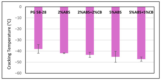 The ABCD test results including the cracking temperature for base PG 58-28, solo ABS-modified, and ABS–carbon black-modified samples are presented in Figure 5. In general, lower cracking temperatures are an indication of better cold-weather cracking resistance. Overall, it was observed that the addition of ABS plastics leads to a better low-temperature cracking resistance performance than the base PG 58-28 binder. On the other hand, the addition of carbon black further enhanced the cold-weather cracking performance of the plastic-modified binder, indicating the positive role of this additive. For example, the cracking temperature of base binder reduced (improved) by −3.8 and −7 °C after the addition of ABS plastics and the blending content increased from 2 to 5%. Additionally, these values were −5.2 and −9.1 °C for asphalt samples containing both ABS and carbon black, with the sample containing 5% ABS and 5% carbon black demonstrating the best crack resistance performance among the tested samples.