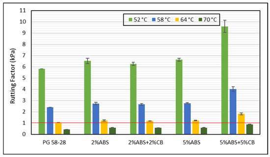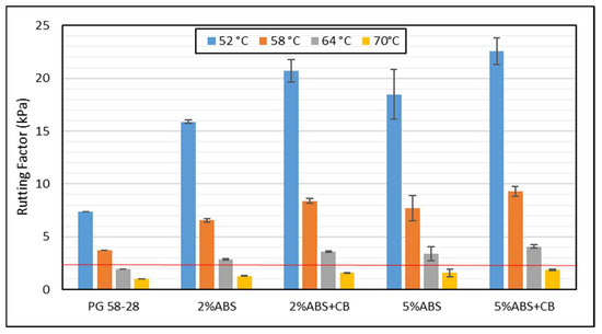 Furthermore, it was observed that the addition of carbon black can further enhance the rutting resistance performance, with samples containing 5% ABS and 5% carbon black showing the best rutting resistance performance. As shown in Figure 7, the positive effects of carbon black after RTFO aging of the asphalt samples is also notable, with the sample containing 5% of ABS plastics and carbon black demonstrating the best anti-rutting performance. At 58 °C, the high service temperature of the base binder, the incorporation of 2% and 5% ABS increased the rutting factor of the base binder by approximately 77% and 108%, respectively. On the other hand, the rutting factor further increased by approximately 28% for the 2% ABS binder and by 21% for the 5% ABS binder when carbon black was added to plastic-modified asphalt, highlighting the beneficial effect of carbon black when used in combination with waste plastics. In general, it was concluded that both samples containing carbon black (e.g., 2% ABS + CB and 5%ABS + CB) show better rutting resistance performance than the samples containing only ABS plastics, with the sample containing 5% ABS and 5% carbon black showing the best rutting resistance performance. Finally, according to the superpave criteria, the asphalt binder should have a rutting factor higher than 1 and 2.2 kPa under unaged and RTFO-aged conditions, respectively. In contrast to the base PG 58-28 binder failing these criteria at 64 °C after RTFO aging, all of the samples containing ABS or carbon black passed these criteria.