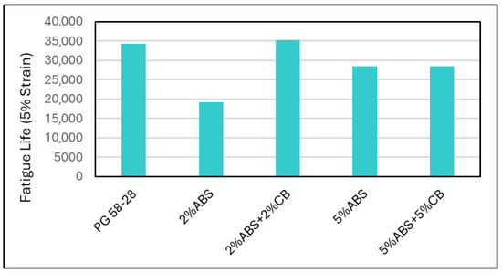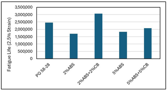 - For fatigue behavior, LAS results showed that the initial incorporation of ABS led to a lower fatigue life compared to virgin asphalt. However, when carbon black was introduced at a blending content of 2% into the ABS-modified samples, there were notable positive effects on fatigue performance under both strain levels. The improvement was particularly notable under the 2.5% strain level. Conversely, increasing the blending content of carbon black to 5% did not result in a significant improvement in samples with 5% ABS.