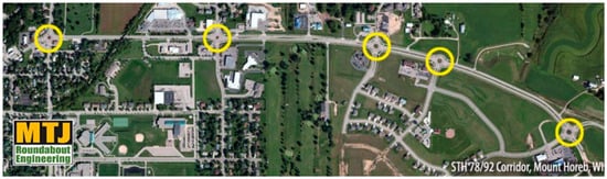 Example of a Roundabout Corridor along STH 78/92 in Mount Horeb WI, with the roundabouts considered in the corridor highlighted by yellow circles. (Source: MTJ Roundabout Engineering Website. Available online: https://www.mtjengineering.com/roundabout_corridors/ (accessed on 28 March 2025)).