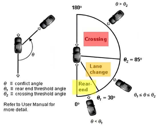 As shown in Figure 2, the SSAM tool classifies conflicts into three types—rear-end, lane-change, and crossing—based on the interaction angle between vehicle paths []. This categorization, combined with the possibility to adjust safety thresholds such as TTC and PET, allows for a refined and scenario-sensitive analysis of vehicle interactions. In this study, the SSAM tool was used in post-processing to assess the safety performance of the roundabout corridors.
