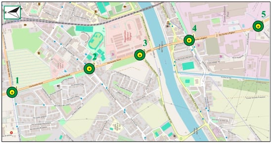 Italian roundabout corridor in Pisa, scale 1:15,000, with the numbered circles indicating the five roundabouts that compose the corridor. (Source: OpenStreetMap. Available online: https://www.openstreetmap.org/ (accessed on 21 February 2025)).
