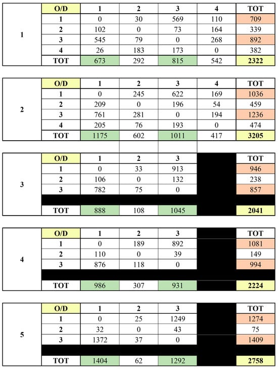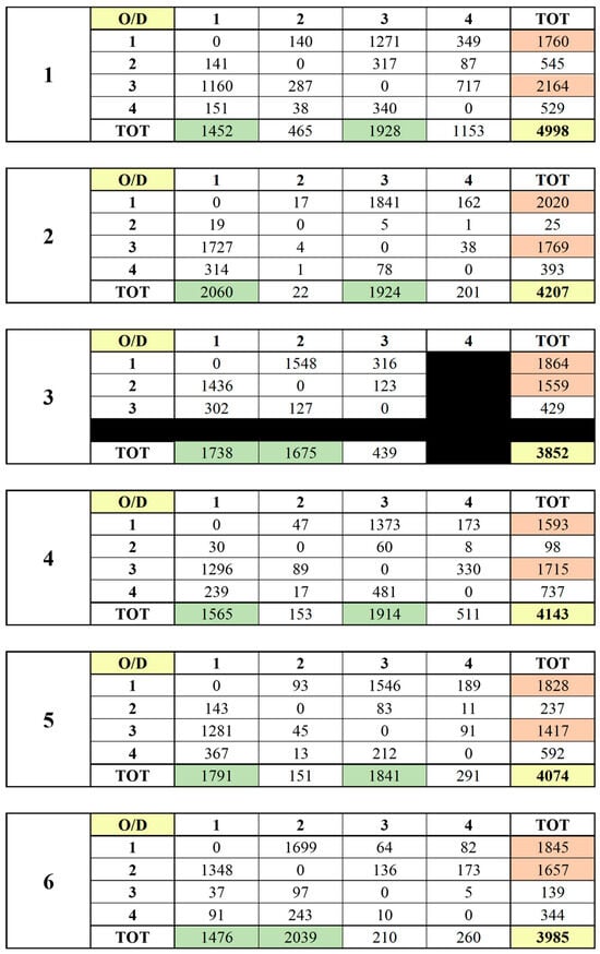 The corresponding O/D matrices used to simulate traffic demand in the Pisa corridor are presented in Figure 5. These were obtained through direct field traffic surveys and subsequently processed to define entry flows and turn proportions at each junction within the simulation model.