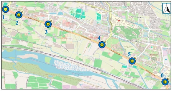 French roundabout corridor in Avignon, scale 1:15,000, with the numbered circles indicating the six intersections that compose the corridor (Source: OpenStreetMap. Available online: https://www.openstreetmap.org/ (accessed on 21 February 2025)).