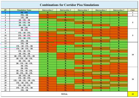 The first case study concerns the Via Aurelia Nord corridor in Pisa (Figure 3), which currently operates as a fully converted roundabout corridor. The simulation model was initially calibrated using ten traffic flow entry points corresponding to the five roundabouts along the corridor. As described in the previous sections, the calibration process aimed to minimize discrepancies between observed and simulated traffic conditions by verifying three key performance indicators: the GEH statistic, the Correlation Coefficient (R), and Theil’s Inequality Coefficient (U). The thresholds adopted for these indicators were defined in accordance with international best practices [,,] and ensured that the model accurately represented real-world traffic dynamics. Once the model reached acceptable accuracy levels, the final calibrated parameters were set as follows: Simulation Step = 0.80 s; Reaction Time at Stop = 1.20 s; Reaction Time at Traffic Light = 1.60 s. The resulting final discrepancy indices confirmed the reliability of the model: R (Correlation Coefficient) = 0.830; U (Theil’s Inequality Coefficient) = 0.096; Mean GEH Statistic = 4.822. Following calibration, a total of 32 simulations were conducted to explore all feasible combinations of roundabouts (Rs) and traffic-light-controlled intersections (TLs) along the five-node corridor. These configurations include the current layout (5R-0TL, ID 1), its opposite (5TL-0R, ID 2), and a full range of intermediate hybrid layouts. As shown in Figure 9, each configuration is identified by a unique ID and describes the specific control type applied at each intersection.