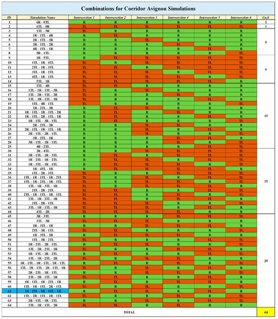 The second case study focuses on the Route de Marseille corridor in Avignon (Figure 6), currently operating as a hybrid corridor with six intersections, three of which are already configured as roundabouts. The simulation model was calibrated using twelve traffic flow entry points corresponding to the six intersections. As outlined in previous sections, the calibration aimed to minimize discrepancies between observed and simulated traffic conditions by verifying three key performance indicators: the GEH statistic, the Correlation Coefficient (R), and Theil’s Inequality Coefficient (U), using the thresholds recommended in the established calibration guidelines [,,]. Once acceptable accuracy was achieved, the final calibrated parameters were set as follows: Simulation Step = 0.50 s; Reaction Time at Stop = 0.80 s; Reaction Time at Traffic Light = 0.80 s. The final discrepancy indices confirmed the reliability of the model: R (Correlation Coefficient) = 0.848; U (Theil’s Inequality Coefficient) = 0.066; Mean GEH Statistic = 4.781. Following calibration, 64 simulations were conducted to explore all feasible combinations of roundabouts (Rs) and traffic-light-controlled intersections (TLs) along the six-node corridor. These included the current layout (1R-2TL-1R-1TL-1R, ID 61), the full roundabout scenario (6R-0TL, ID 1), the full signalized scenario (0R-6TL, ID 2), and a range of intermediate hybrid layouts. As shown in Figure 11, each configuration is identified by a unique ID and specifies the control type applied at each intersection.