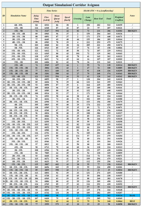 Simulation outputs for the 64 intersection configurations of the Avignon corridor. The blue row indicates the current layout, the yellow row the best configuration in terms of efficiency and safety, and the grey rows the broken configurations. (Source: authors).