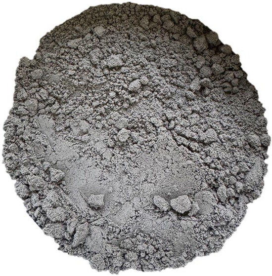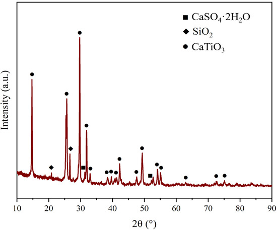 Phosphogypsum used in this study came from Xiaogan City, Hubei Province, China, with an exposure time in natural environment of over 24 months. Phosphogypsum in natural environments often appears as a gray powder, as presented in Figure 1. Figure 2 shows X-ray diffraction (XRD) spectrogram of phosphogypsum. It indicates that calcium sulfate dihydrate (CaSO4 • 2H2O) is the main component of phosphogypsum, accounting for over 90%, while the other typical crystal composition is SiO2 and CaTiO3. Figure 3 illustrates element composition of phosphogypsum introduced in this study by their common forms of oxides. We stored phosphogypsum in a dry environment with a moisture content of 6.5%. Particle size distribution and screening results of phosphogypsum are shown in Table 1, in which 98.1% particle diameter was less than 0.075 mm via mechanical screening of powders according to “Test Methods of Aggregate for High way Engineering (JTG E42-2005)” [29].