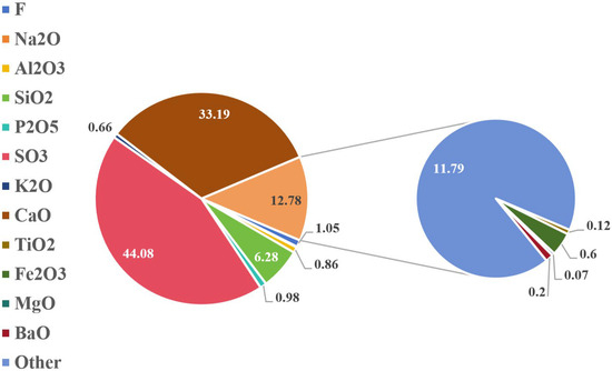 Figure 3 indicated that Ca and S were the dominant elements, constituting CaSO4 that was found to be the main crystalline substance in phosphogypsum. In addition, fluorine and phosphorus elements were also found. Soluble fluoride or phosphate ions in phosphogypsum were thought to be an environmentally harmful substance. Therefore, how to reduce their overflow ion concentration when exposed in the natural environment should be carefully treated to guarantee the harmless treatment of phosphogypsum-based material.