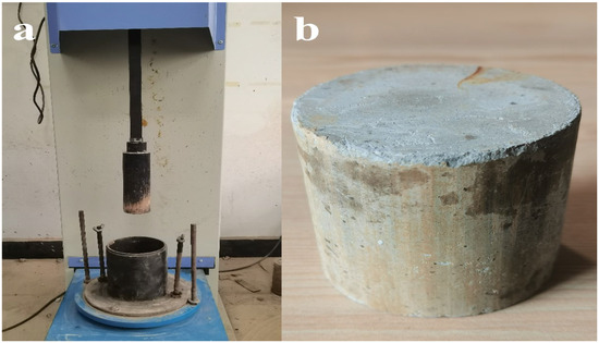 Phosphogypsum, cement, stabilizer, quicklime, and water were manually added and mixed in a specific mold after corresponding optimum moisture contents were determined. Then, the mold with PICM material was set in electric compaction device, presented in Figure 5a. PICM material’s compaction times by driving hammer were set as 27 [35] according to “Test Methods of Materials Stabilized with Inorganic Binders for Highway Engineering (JTG E51-2009)” [36], which should be taken out from mold after 24 h when compaction is finished, as Figure 5b shows. The materials, including phosphogypsum, cement, stabilizer, and quicklime, were first mixed in dry state, which were then mixed with water of optimum content for soaking for 6~8 h. After that, a pressure machine was used to statically compact and produce PICM samples, which were a cylinder of Φ50 mm × 50 mm, Φ150 mm × 150 mm and beam sample of 50 mm × 50 mm × 200 mm.