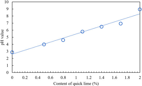 Quicklime produced in Wuhan city, China, also known as calcined lime, was mainly composed of CaO and generally obtained by calcining natural calcium carbonate. It was used as an acidic neutralizing agent for phosphogypsum and attempted to dissolve harmful substances in phosphogypsum [31], due to its potential modification and inhibition effects on acidity and harmful ions. Its quantity in phosphogypsum was set from 0% to 2% considering its effect on neutralizing and suppression on harmful ion overflow. Then, it was set as 2% to 5% when preparing the inorganic cementing material. Properties of quicklime are shown in Table 3, which proved that it meets specification of JC/T 479-2013 (standard for building quicklime) [32].