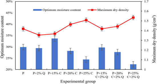 Compaction parameters, including the optimum moisture content and maximum dry density, were systemically characterized. Figure 7 presented the results of the optimum moisture content and maximum dry density of PICM across different experimental groups. Experimental group abbreviations were used, such as “P + 15%C + 2%Q,” which referred to the experimental group of PICM of phosphogypsum, with 15% cement and 2% quicklime, and so forth, while “P” meant original phosphogypsum. It was found that the sample with 2% quicklime showed lower optimum moisture content than that of the sample without quicklime, independent of the cement content. Furthermore, the cement content was positively correlated with PICM samples’ maximum dry density, regardless of the quicklime content. On the contrary, the optimum moisture content illustrated a decreasing tendency as the cement content rose. Higher cement content was proved to develop PICM’s maximum dry density and lower corresponding optimum moisture content. The maximum dry density of P + 25%C + 2%Q was about 0.1 g/cm3 higher than that of P + 20%C + 2%Q, considering that the theoretical density increase, namely before the chemical reaction, was only 0.06 g/cm3 when 5% more cement was added. This suggested that a higher cement content would result in a lower porosity of PICM. Similarly, 2% quicklime was detected to increase the maximum dry density but reduce the optimum moisture content of PICM with cement. The alkalinity enhancement presented in Figure 6 promoted the production of ettringite, which contributed to the higher compactness of PICM.