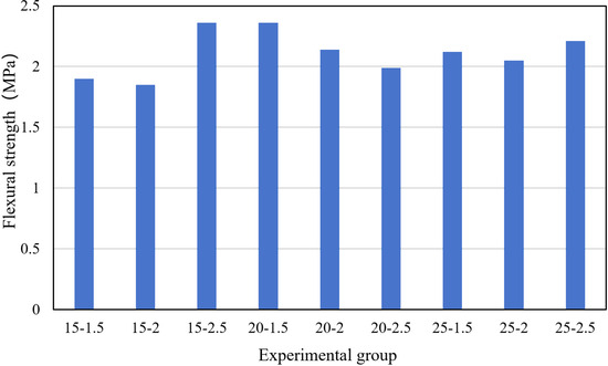 PICM samples were kept in a standard maintainer for cement concrete for 7 and 28 days after their compaction finished. The unconfined compression strength of PICM with different maintenance times is shown in Figure 8. The standard deviation of each result with the same testing parameters was found to range from 0.53 to 2.25, showing adequate statistical significance. Experimental groups were abbreviated, like “15-2.5”, which meant the corresponding PICM composition was 100% phosphogypsum, with 15% cement and 2.5% stabilizer, and so on. It should be emphasized that the quicklime content was 2% for each PICM sample. PICM’s 28 d compression strength was generally over 30 MPa, which can meet the specification limit for the material of affiliated facility of highway according to “Technical Specifications for Construction of Traffic Engineering and Affiliated Facility of Highway Tunnel JTG/T 3661-2025”. It might also be used as a material for temporary or access roads in site and low-grade pavement. Meanwhile, the unconfined compression strength of other phosphogypsum-based cementitious materials, like Shen [39] and Dutta [23] reported, was found to be 8 MPa and 2.2 MPa, respectively. This suggested that the PICM introduced in this study showed much higher strength than typical phosphogypsum-based material. Samples with 25% cement showed higher unconfined compression strength. Higher maximum dry density, as shown in Figure 8, may lead to higher strength. It was obvious that a longer maintenance time would result in higher compression strength, of which PICM with 25% cement and 2.5% stabilizer presented the highest unconfined compression strength, regardless of the maintenance time. It proved that extra stabilizers, which perform as a binder, can further enhance PICM’s strength. The flexural strength results of PICM were also obtained after 7 d maintenance, as implied in Figure 9, and the corresponding standard deviation ranged from 1.92 to 5.32. However, its results did not show significant regularity. To conclude, PICM can be used as a subgrade material or temporary facility material such as access road and auxiliary facility materials in road engineering owing to its adequate strength.