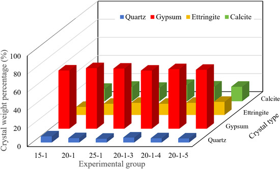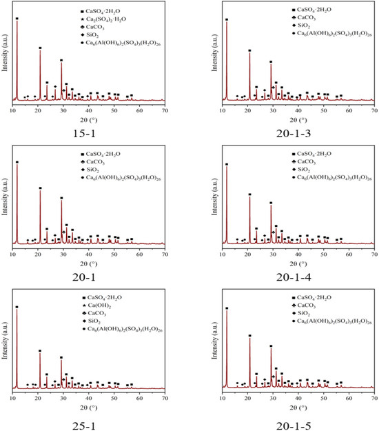 Figure 10 illustrates the X-ray diffraction spectrum of PICM with different compositions after 7-day maintenance. It can be seen from the spectrum that the main composition of PICM was SiO2, CaSO4·2H2O, Ca6(Al(OH)6)2(SO4)3(H2O)26, and CaCO3, namely quartz, gypsum, ettringite, and calcite, respectively. In addition, the 15-2 sample contained 6.4% bassanite (Ca2(SO4)2(H2O)), which was transferred from gypsum and with higher strength. Compared with the 20-2 sample, the 25-2 sample was found to have an extra 1.3% portlandite (Ca(OH)2). Figure 11 presented the composition analyzed from the XRD spectrum. The quartz content illustrated a decreasing tendency as the cement content and quicklime content rose. On the contrary, the ettringite content presented a rising trend when the cement and quicklime content increased. More cement and quicklime created an environment with higher alkalinity, contributing to higher ettringite production, which is usually generated in an alkaline environment. Therefore, PICM’s strength might be enhanced by a greater addition of quicklime since ettringite was of relatively high stiffness. In addition, the quicklime content had a negative effect on the calcite content.