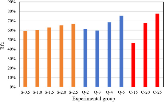 In addition, cylindrical samples of Φ150 mm × 150 mm were prepared and divided into frost group and control group. Unconfined compression strengths of PICM samples of control group (Sc) should be tested when their 28-day maintenance is finished, during which the samples should be saturated for at least 24 h. Frost group was placed in a low-temperature chamber for freezing treatment, which was usually frozen for 16 h. Then, the samples were removed and put into a water bath box at 20 °C for melting treatment, whose time was set as 8 h. Then, freeze–thawing process should be repeated and stopped when average mass loss rate of frost group exceeds 5% of their mass. Afterwards, unconfined compression strengths of frost group (Sft) were tested. Ratio of unconfined compression strength of frost group to that of control group (Rfc) was calculated using Equation (1):