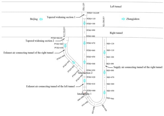 This project is based on the Xiaolongmen Extra-long Tunnel of the Beijing–Zhangjiakou Expressway in China. The tunnel has a total length of 6.4 km and adopts a longitudinal segmented ventilation design. To meet the requirements of tunnel ventilation and smoke exhaust under fire emergency conditions, a ventilation shaft needs to be set up at about 95 m to the right of K1+362.013 in the right tunnel. Underground supply and exhaust air connecting tunnels should be constructed to connect with the main tunnel. The right tunnel is equipped with one supply air duct and one exhaust air duct, respectively, while the left tunnel is only provided with an exhaust air duct. The positional relationship of relevant underground facilities is shown in Figure 1. The total length of the underground supply and exhaust air connecting tunnels connecting with the main tunnel is 312.323 m. The underground connecting tunnel has 2 intersections and 2 transition widening sections. Since the connecting tunnel cannot be constructed in parallel, the construction period is long, and the construction technology and procedures are complex.