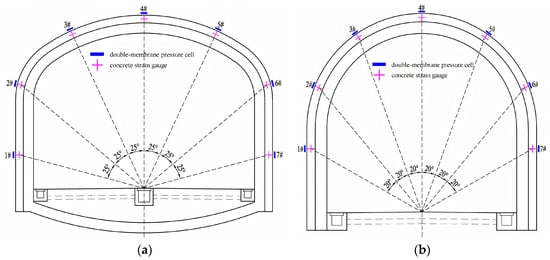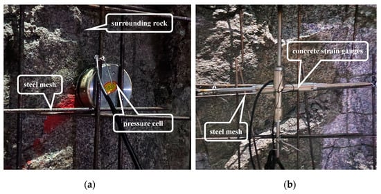 To ensure construction safety, the stress variation in the surrounding rock around the connecting tunnels and concrete strain should be monitored during the construction. One test section is, respectively, selected in the exhaust air connecting tunnel and supply air connecting tunnel of the right tunnel, namely the right exhaust test section and right supply test section. The mileage post of the right exhaust test section is PYK0+060, as shown in Figure 2a. A total of seven measuring points are selected in this section, with an interval of 25 degrees between adjacent points. Each measuring point is equipped with one double membrane pressure cell and two concrete strain gauges, which are used to monitor the stress variation in the surrounding rock of the connecting tunnel and the strain of the primary lining concrete, respectively. The mileage post of the right supply test section is SK0+120. Similarly, seven measuring points are selected with an interval of 20° between adjacent points. The installation rules for double membrane pressure cells and concrete strain gauges are the same as those for the previously described test section (as shown in Figure 2b). As shown in Figure 3, the double membrane pressure cells are tightly attached to the surrounding rock and fixed with steel brackets to monitor the rock pressure. The concrete strain gauges are arranged in a cross shape and fixed on the steel reinforcement mesh to monitor the concrete strain in different directions. The measuring range of the pressure cells used is 1.5 MPa, and the tensile and compressive strain ranges of the concrete strain gauges are 1200 με and 800 με, respectively.