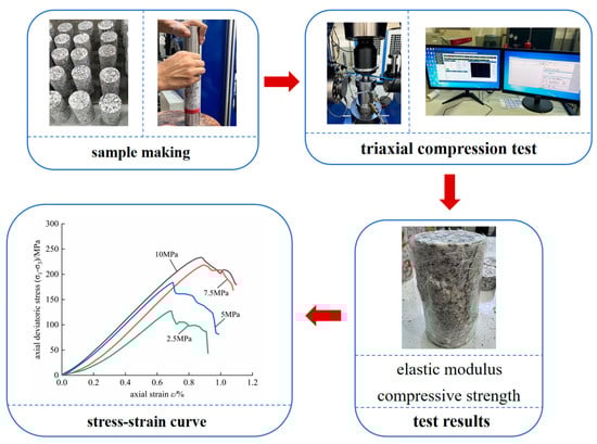To analyze the failure modes of the surrounding rock during the excavation of the connecting tunnel, a granite triaxial compression test was conducted (as shown in Figure 4). The relevant test results can also provide a theoretical basis for subsequent numerical modeling. After drilling and sampling rock layers at the construction site, standard cylindrical granite specimens with a height of 100 mm and a diameter of 50 mm were prepared. After the test, relevant data were extracted to plot the stress–strain curves of the granite specimens under indoor triaxial compression tests. Based on the test results, the specimen mainly exhibited elastic deformation before compressive yielding, and its yield strength was close to the ultimate strength. When the confining pressure was within 5 MPa, the specimen showed a brief steep stress drop immediately after reaching the ultimate strength, indicating brittle failure at this stage. Thereafter, the stress–strain curve changed in a gentler trend until another steep stress drop occurred, leading to complete failure. When the confining pressure is above 7.5 MPa, the specimen does not exhibit a particularly significant steep stress drop after reaching the ultimate strength. The stress–strain curve changes gently, and the specimen gradually softens. In this project, the stratum where the main tunnel and connecting tunnels are located is relatively deep, with a large surrounding confining pressure (above 10 MPa). When the confining pressure is greater than 10 MPa, the yield strength of the surrounding rock should be greater than 240 MPa, indicating good stability of the surrounding rock.