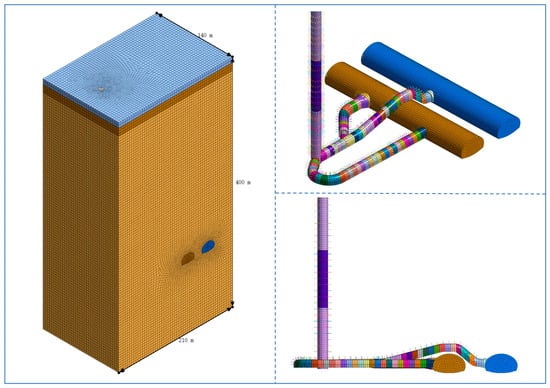 Based on the geological survey results of the construction site, the surrounding rock grade of the stratum in the construction area is Grade III, indicating the good self-stability of the surrounding rock. As shown in Figure 5, the MIDAS GTS NX software (is used to establish a 1:1 numerical simulation model (MIDAS GTS NX 2022 R1 (x64)). To maximize the reproduction of on-site excavation and avoid the influence of stratum boundary effects, the computational model includes the tunnel, shaft, and connecting tunnels, with length × width × height dimensions being 210 m × 140 m × 400 m. During the numerical simulation of on-site excavation, the connecting tunnels are mainly excavated using the full-face drill-and-blast method with an advancement of 2 m per round. To minimize the disturbance to the surrounding stratum and adjacent main tunnel during the construction of connecting tunnels, the widened transition sections and overcrossing sections are excavated using the bench cut method with an advancement of 0.6 m per round.