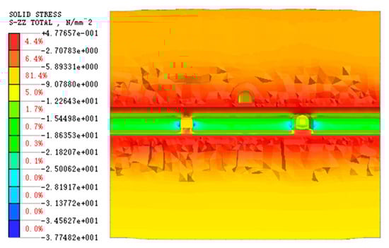 Distribution of vertical stress in the surrounding rock around the connecting tunnel under the corresponding working condition.