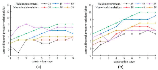 To verify the accuracy of numerical simulation results, comparative analysis was conducted between field monitoring results and numerical simulation results under the same working condition. Taking the surrounding rock stress measured in the first field monitoring as the initial value (Figure 6 shows the numerical simulation results of surrounding rock stress under the corresponding working condition), the variation values of surrounding rock stress at selected measuring points (Points 3#, 4#, and 5#) on the right exhaust test section and right supply test section were compared with the corresponding numerical simulation results. As shown in Figure 7, after the variation pattern of field monitoring data became relatively stable, the measured and simulated results of 9 different construction stages were, respectively, extracted from the two test sections and plotted into curves.