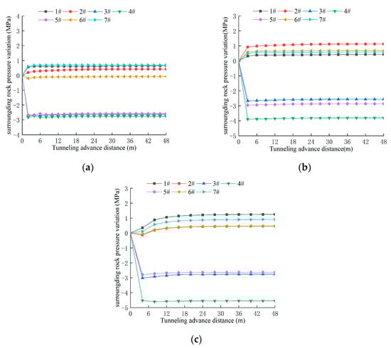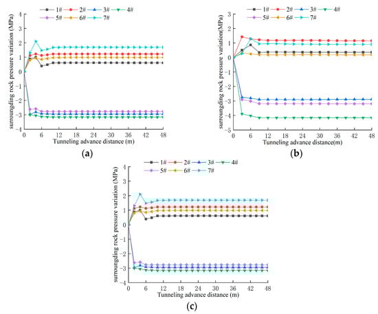 Stress variation in surrounding rock around the right supply test section under different excavation step distances: (a) 2 m; (b) 3 m; (c) 4 m.