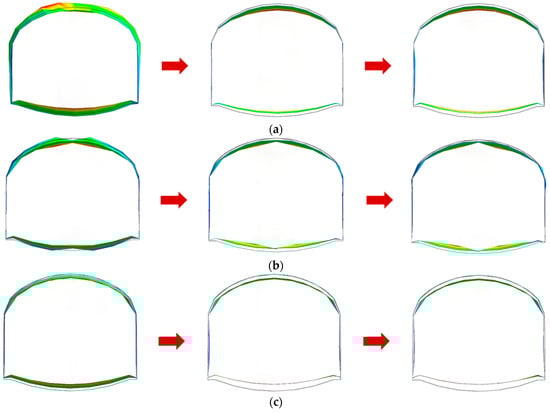 Deformation development process of the primary lining concrete under different excavation step distances: (a) 2 m; (b) 3 m; (c) 4 m. (The colors in the figure represent the deformation of the primary lining concrete of the connecting tunnel.)