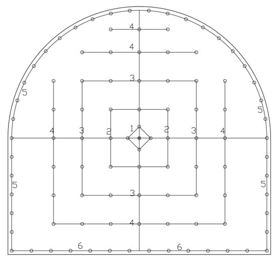 Borehole layout diagram for the right-line exhaust connecting tunnel. (The numbers in the figure correspond to the ring numbers in Table 2 respectively.)